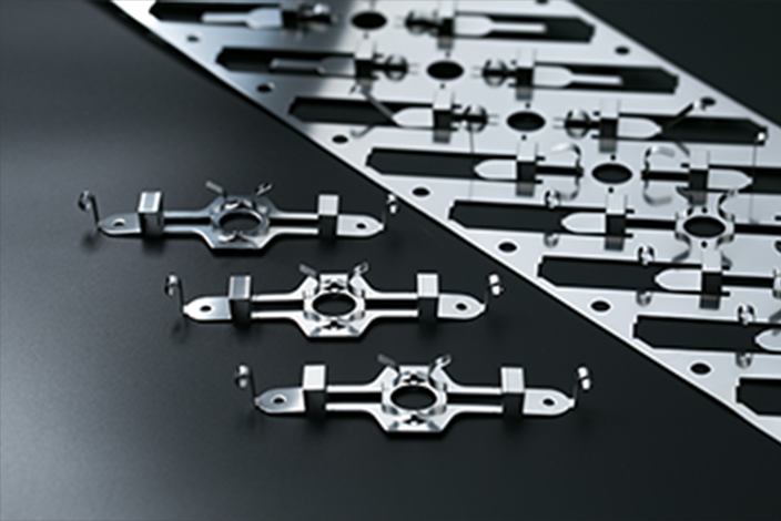 小諸工場では、順送によるプレス加工品、単発金型による金属プレス加工品、それぞれの加工品の組み合わせによる複合加工品と幅広い製品を生産しております。